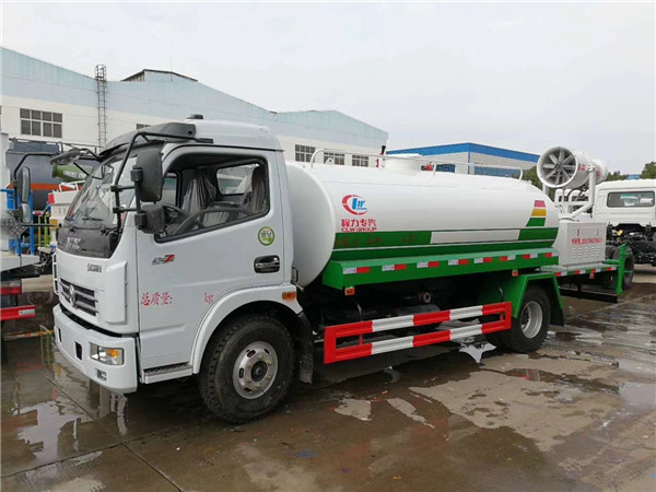 该车多功能雾炮车水箱可盛水8吨,本身具备洒水车功能,不同之处就是安装在车体后半部分的远距离喷雾系统,又称“雾炮”。该系统可以俯仰和水平旋转180度,筒口安装有数十个喷水口,其工作原理是在液泵喷水后, 通过调节风压改变喷雾的薄厚程度,整套系统采用车载式发动机组自供电源,可实现驾驶室或远程遥控控制。