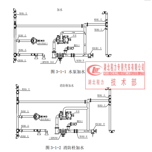 4、 各作业操纵使用说明 (1) 向罐内加水 将车开到预订位置,使水罐口对准自来水管口打开罐口盖、自来水即可加水。 当在野外自采水的情况下,水能通过水泵给罐内供水,其操作程序是:在三通球阀 G 处 接一胶管,调节三通球阀 G 到如图位置(注意:三通球阀凹坑所对方向关闭),关闭不锈钢球 阀 A、B、C、D、E、F 和栓 I,打开铝合金球阀 H,踏下离合,打开取力器开关,慢慢松 开离合(千万不可过快,否则将会损坏取力器或变速箱),使水泵开始工作,即可向罐内加水, 停止工作后开关回位。 工作水路示意:水经过三通球阀 G、过滤网、泵、铝合金球阀 H、水罐。(其中 A、B、C、 D、E、F、H 关闭)。 图 3-1-1水泵加水 图 3-1-2 栓加水 工作水路示意:水经过栓开关 I、铝合金球阀 H、水罐。(其中 A、B、C、D、E、F、 G、H 关闭)。