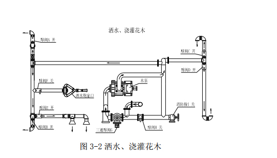 (3)应急 在应急时,其操作程序是:调节三通球阀 G 到如图位置(注意:三通球阀凹坑所 对方向关闭),关闭不锈钢球阀 A、B、C、D、E 和铝合金球阀 H,打开栓 I 和不锈钢 球阀 F,踏下离合,打开取力器开关,慢慢松开离合(千万不可过快,否则将会损坏取力 器或变速箱),使水泵开始工作,即可通过洒水炮和栓出口应急,停止工作后开 关回位。 工作水路示意:水经过水罐出口、三通球阀 G、过滤网、泵、栓和洒水炮。(其中 A、 B、C、D、E、H 关闭)。 图 3-3 应急