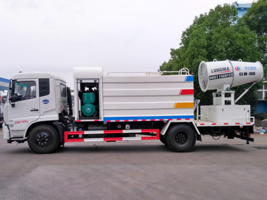 新款东风天锦11方雾炮车又称:洒水抑尘车,雾炮降霾车,多功能雾炮洒水车,喷雾降尘车,绿化喷洒车,也被称为“治霾神器”的一种环保远射程高空喷雾车,东风天锦抑尘车装备的雾炮可喷50-80米高的水雾,并且可以360度全方位旋转,可遥控操作。东风天锦雾炮车可用于喷雾降尘、城市雾霾治理等工作,经环保部门测试,其可将空气中的PM10浓度降低15%左右。