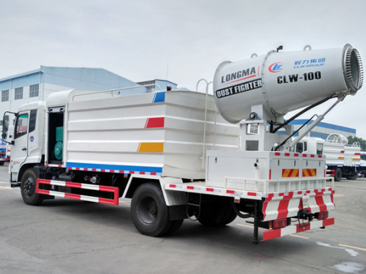 新款东风天锦11方雾炮车又称:洒水抑尘车,雾炮降霾车,多功能雾炮洒水车,喷雾降尘车,绿化喷洒车,也被称为“治霾神器”的一种环保远射程高空喷雾车,东风天锦抑尘车装备的雾炮可喷50-80米高的水雾,并且可以360度全方位旋转,可遥控操作。东风天锦雾炮车可用于喷雾降尘、城市雾霾治理等工作,经环保部门测试,其可将空气中的PM10浓度降低15%左右。